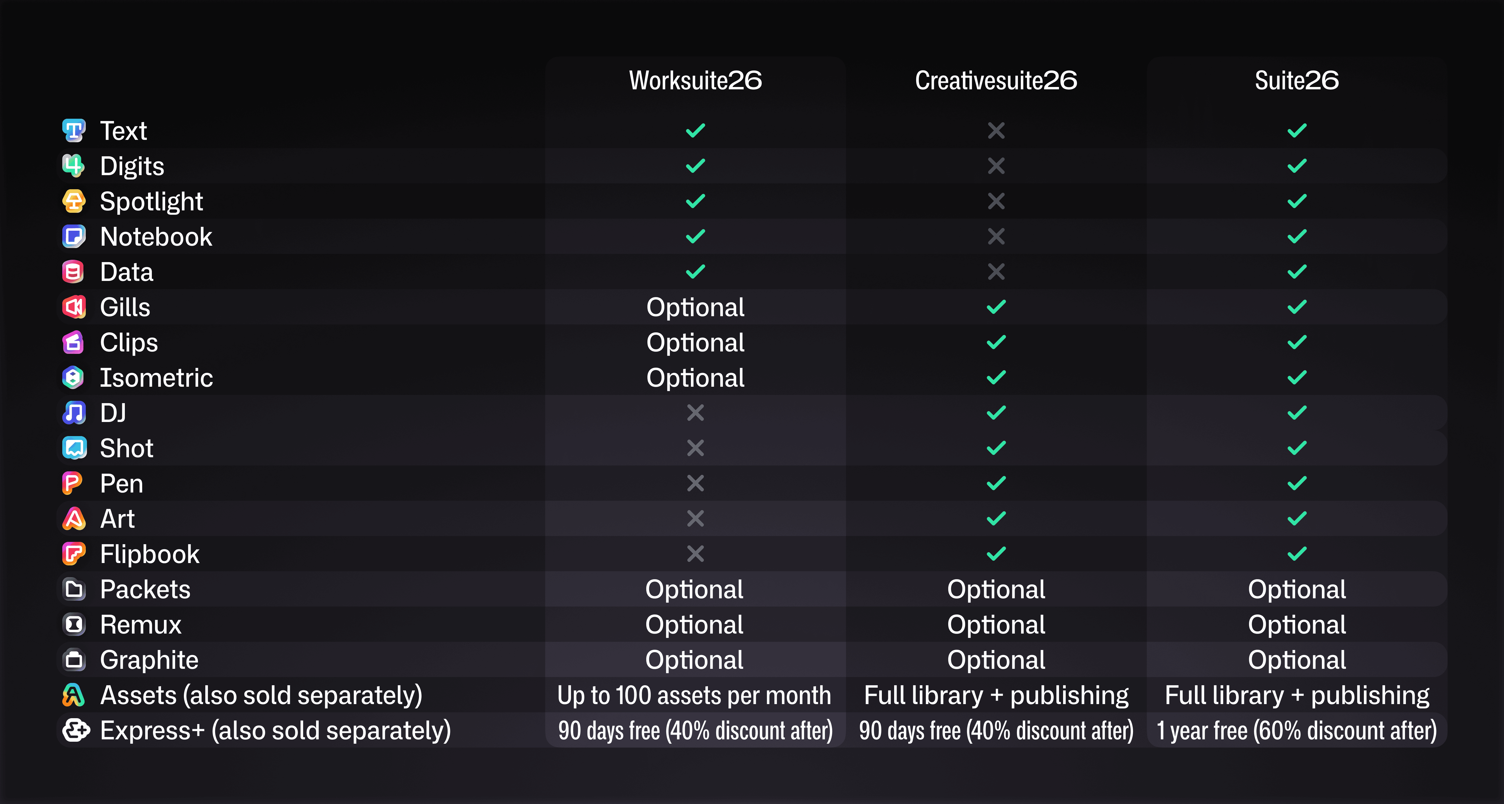 Createsuite26 includes everything creators need to do their best work. From power video editing to wonderful graphic design tools, Createsuite26 does it all.