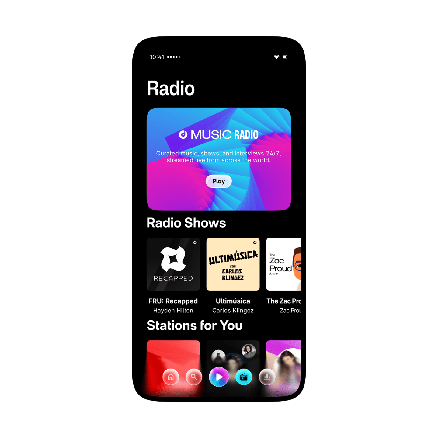 In Deats Music, turn on Deats Radio to listen to curated music 24/7. You can also listen to artist-specific radios or your Personal Station by pressing the Play button.