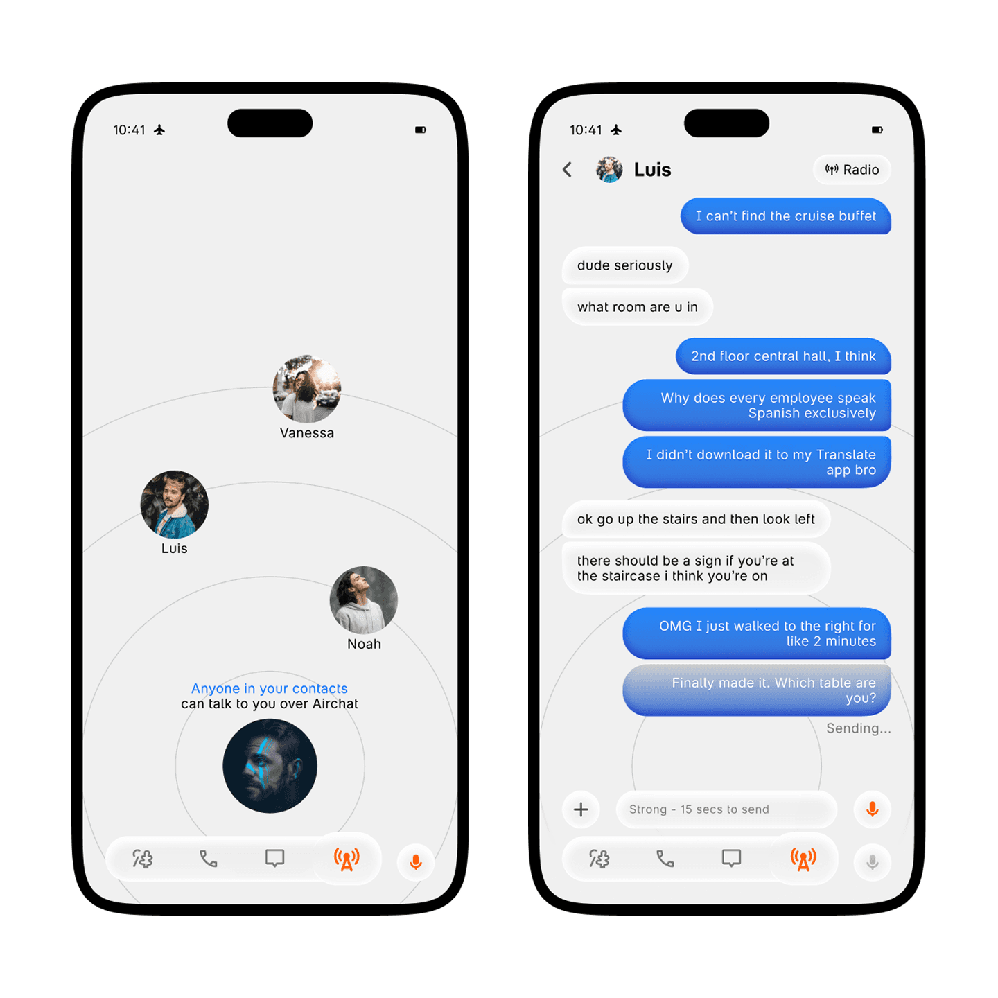 Airchat and Radio are two entirely new ways of communication, even when you don't have internet. Using Hyper Network 2's extended range, send messages in Airchat in seconds. And when things need to be more live, turn on Radio for a walkie-talkie like experience.