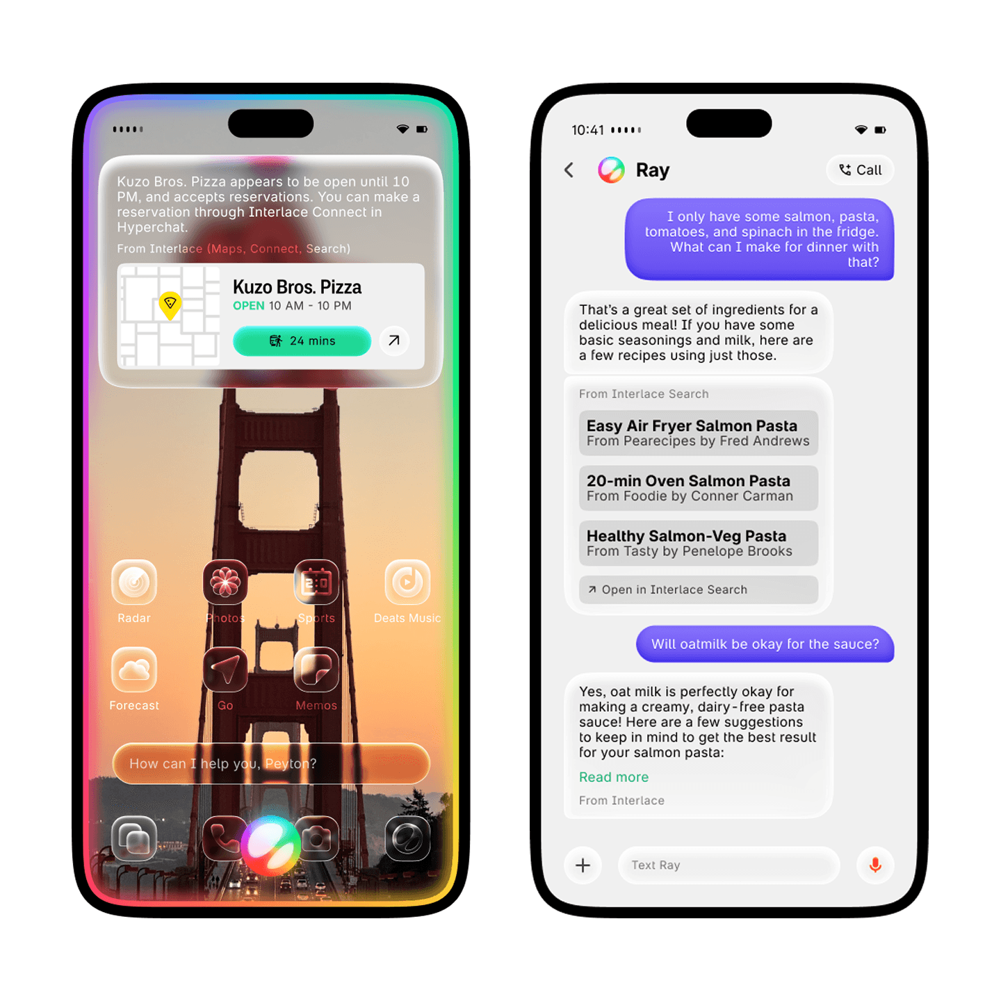 With the power of Interlace, Ray can find just about anything for you. Search up a new recipe, find the latest story, or figure out when that one sushi place closes. If it’s on the internet, Interlace and Ray can find it for you.