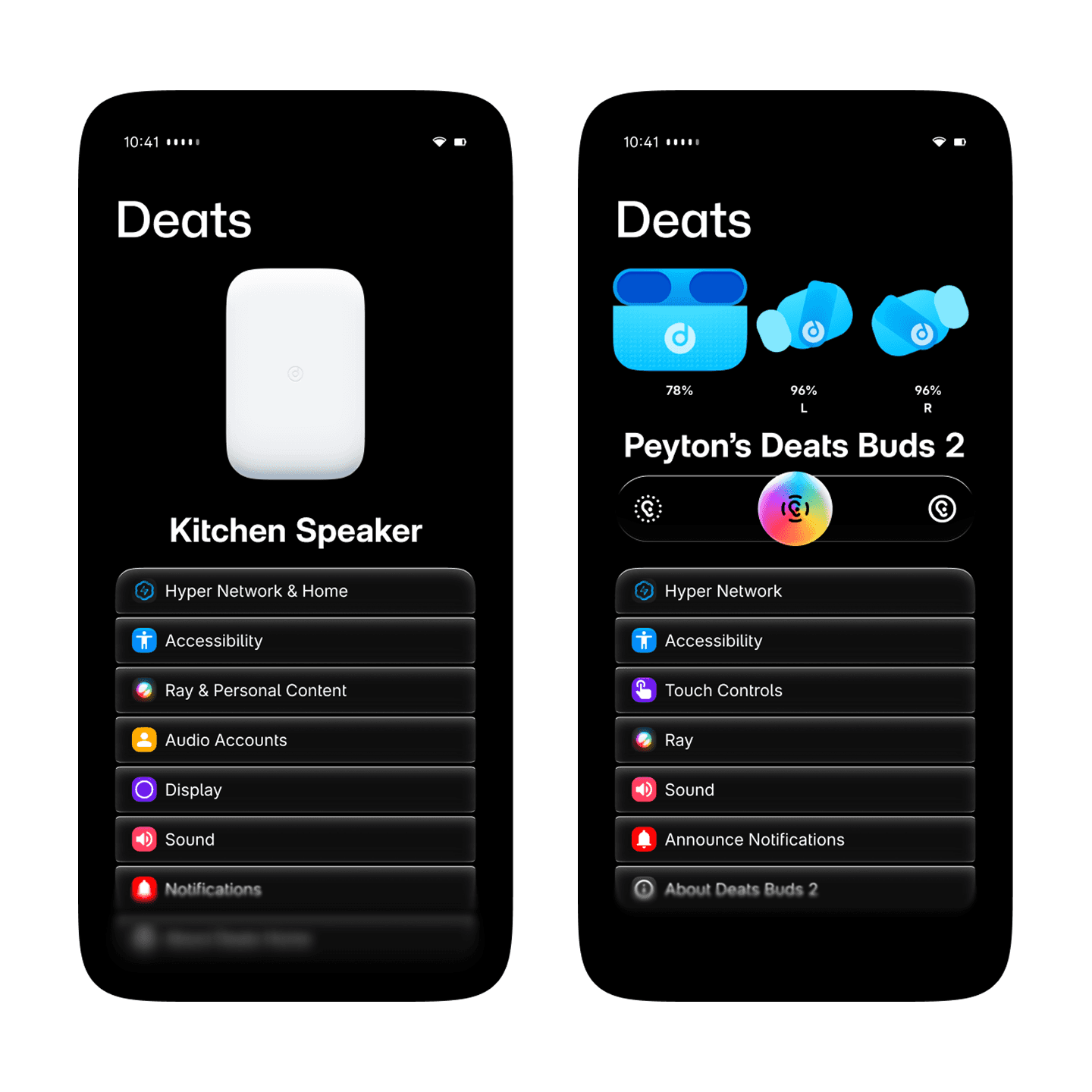 The Deats app makes it easy to manage your Deats devices and settings. On Hyper Network 2 enabled devices, the Deats app can be used to start an AudioShare session, allowing multiple people to listen to something at the same time in their own pair of Deats.